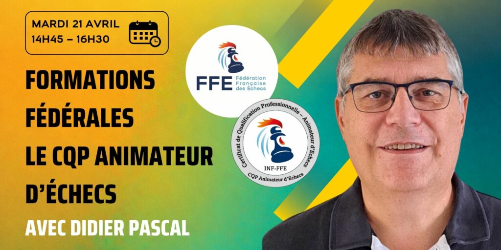 Mardi 21 avril à 14h45 : réunion sur la formation et le CQP Animateur d’Échecs par samuelb · Publié 21 avril 2026 · Mis à jour 21 avril 2026 Mardi 21 avril de 14h45 à 16h30, Didier Pascal anime une réunion sur la formation fédérale, et le CQP animateur d’Échecs. La conférence aura lieu dans une salle dédiée, située dans le hall d’accueil.