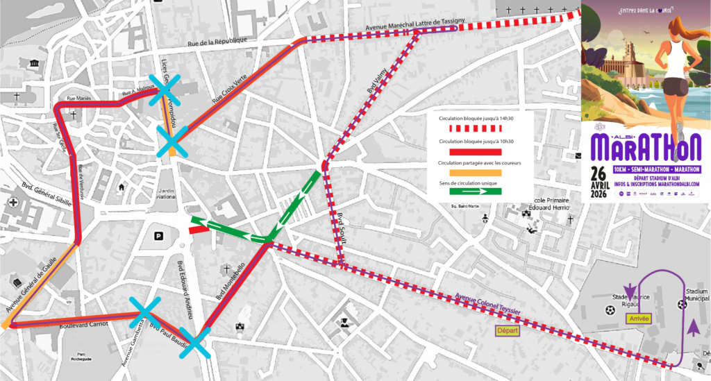 La circulation en centre ville d’Albi sera largement perturbée ce dimanche 26 avril au matin en raison de l’organisation du Marathon. Si vous êtes amenés à circuler par cette zone, nous vous conseillons vivement d’anticiper votre trajet afin de ne pas manquer le début de la dernière ronde ! Attention également aux bouchons à l’arrivée au Parc Expo.