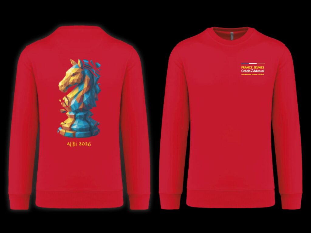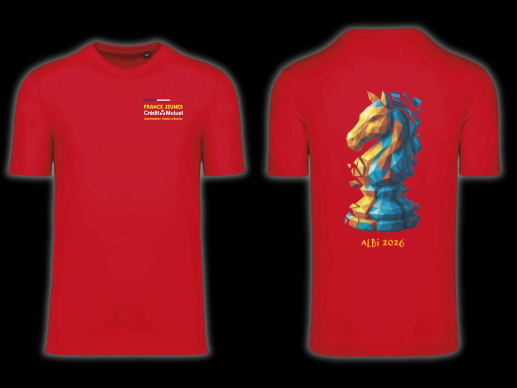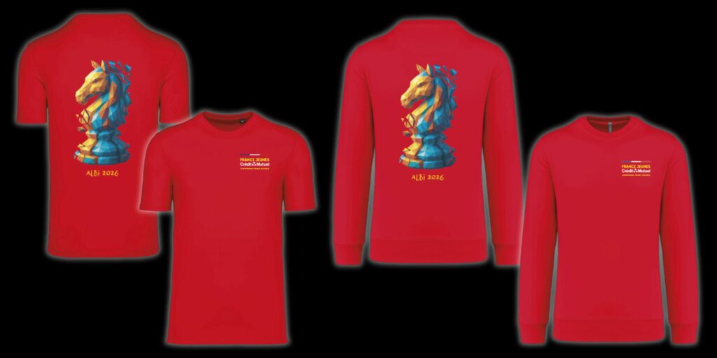 Vous allez participer au Championnat de France d’Échecs Jeunes 2026 à Albi ? Alors repartez avec un souvenir à la hauteur de l’événement ! Nous vous proposons le T-shirt et le Sweatshirt officiels du tournoi, parfaits pour prolonger la magie de cette grande fête des échecs.